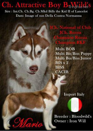 ![]() ATTRACTIVE BOY B-WILD'S ![]() Multi Bis/Biss Junior Champion National of Club, Russian Junior Champion, Russian Champion, RKF Champion, Russian Grand Champion, NKP Champion, RFLS Champion |